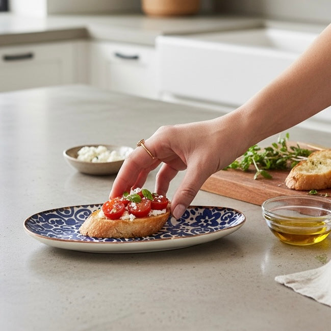 A visually stunning blue print against an off white background with brown rim. A cute plate to use as a spoon rest, for condiments, for a small snack or as a jewellery dish