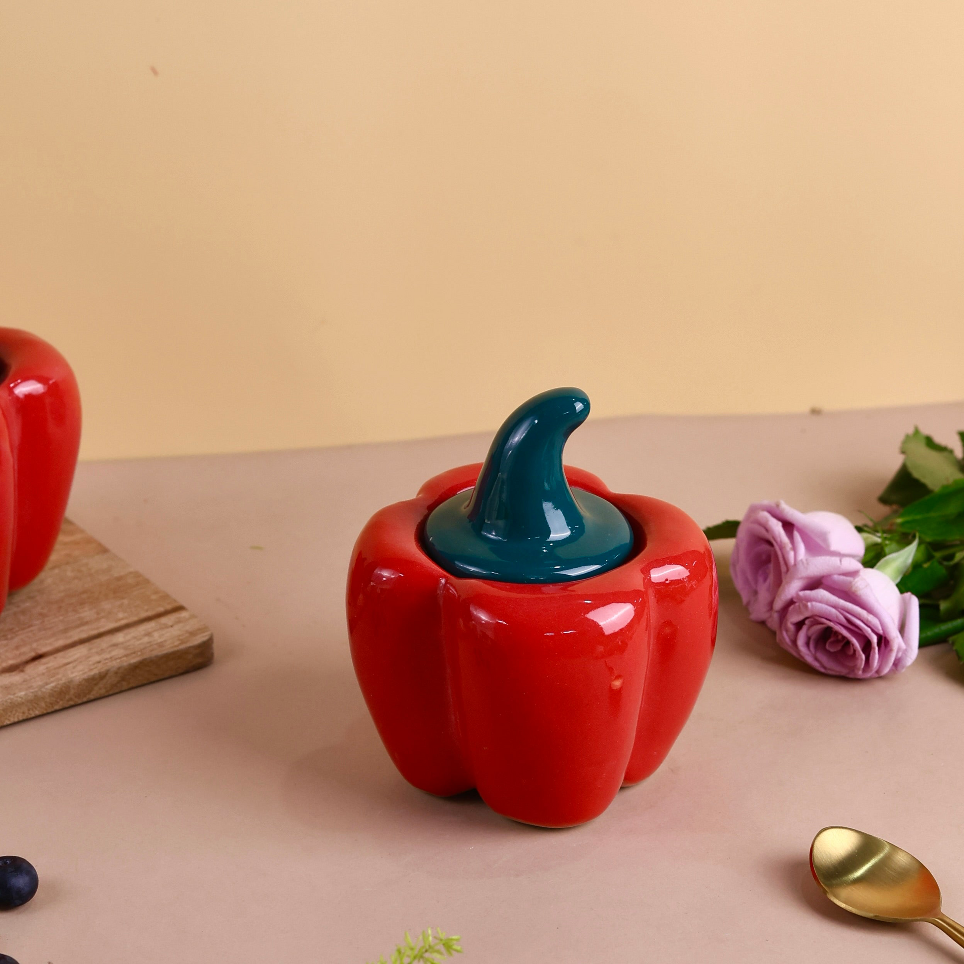 Enhance your kitchen decor with these charming ceramic bell pepper containers. Crafted from durable stoneware, these jars add a touch of elegance to any countertop or dining setting. The lids, though not airtight, add a whimsical flair to these functional pieces.