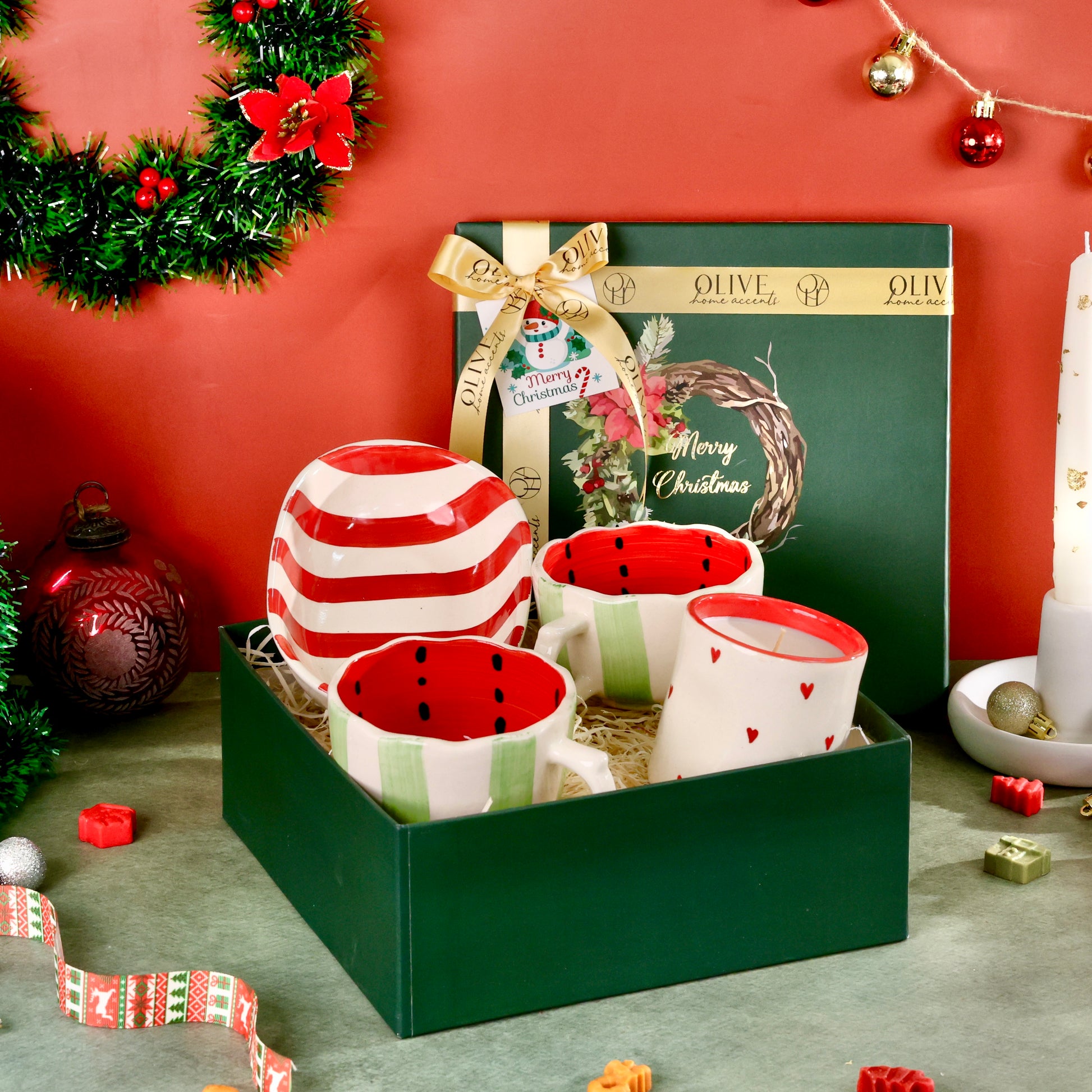 Sip on the spirit of the holidays with two charming watermelon mugs. Adorned with festive details, these mugs add a whimsical touch to your celebrations, creating moments of warmth and joy with each cup.