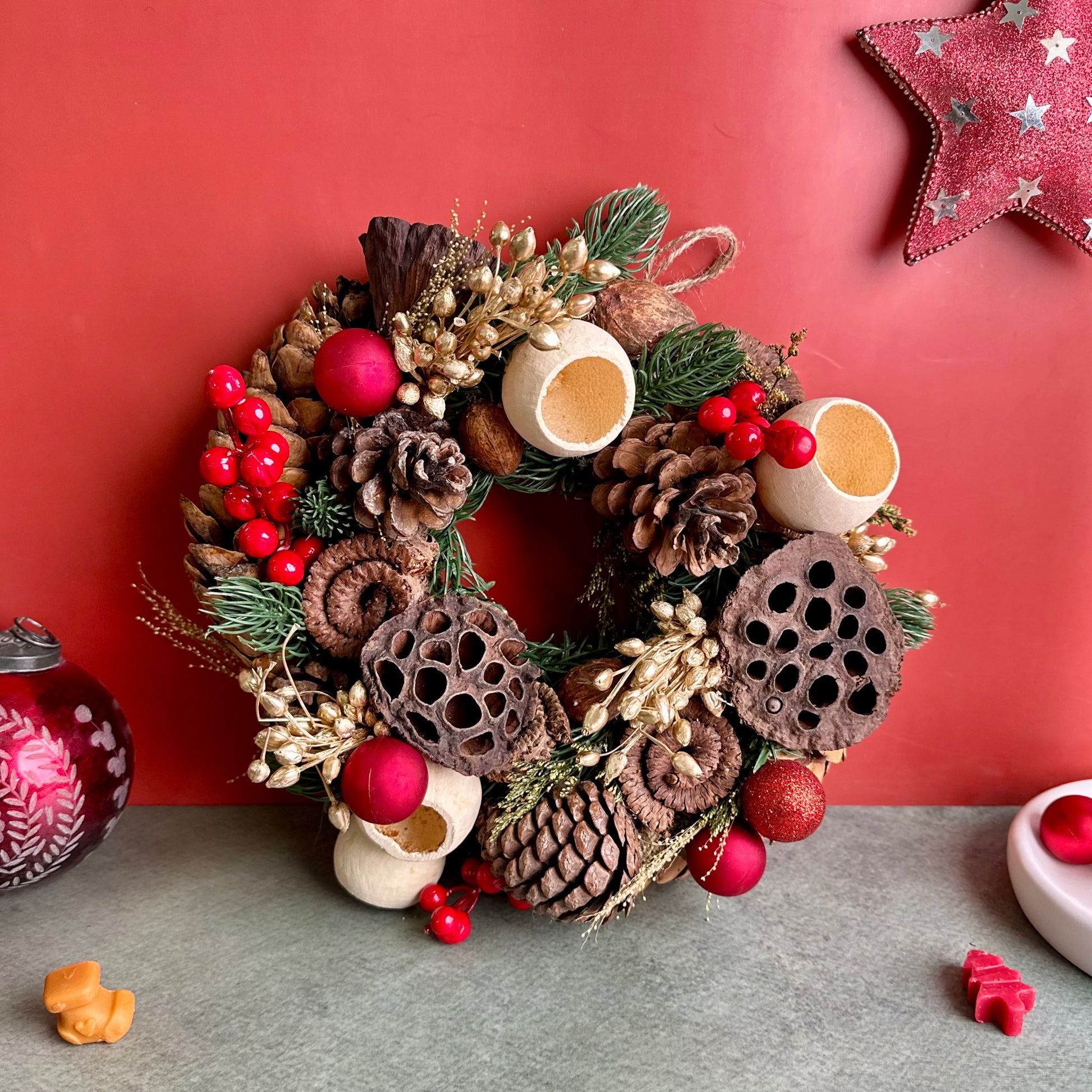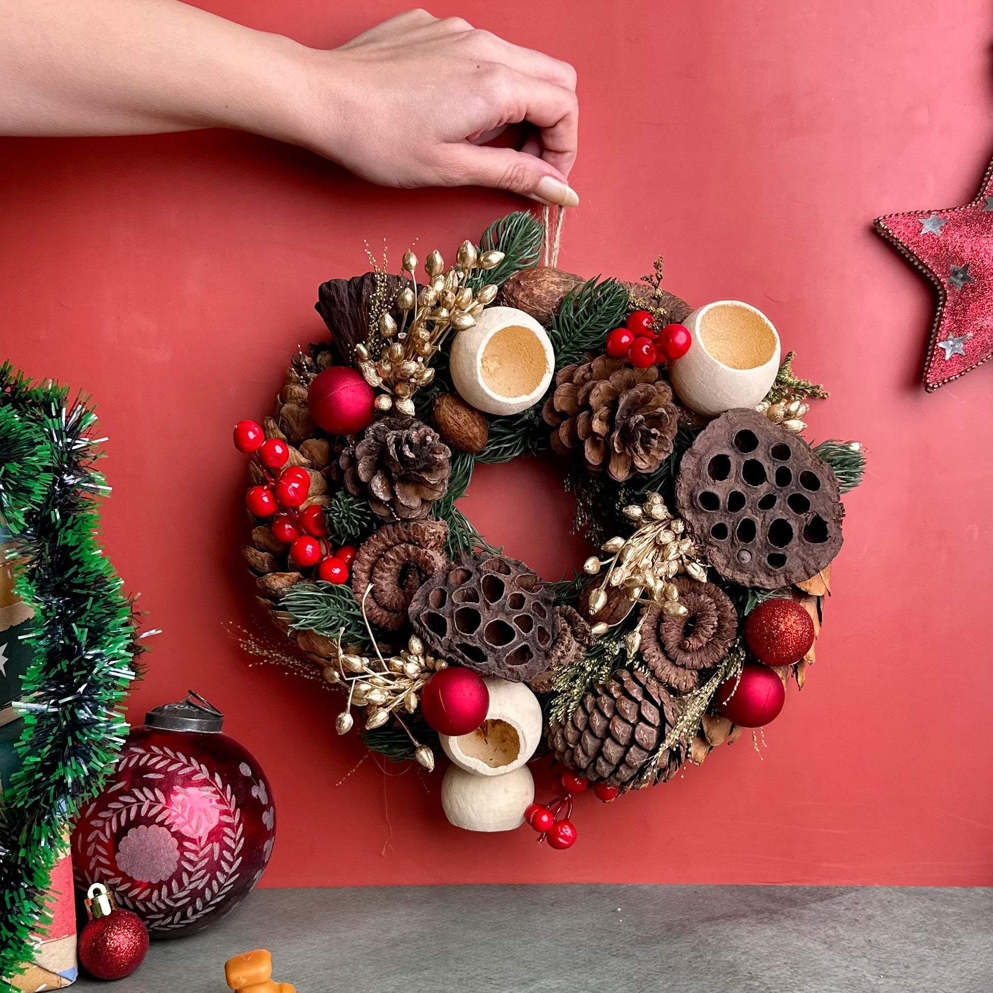 Bring timeless festive charm to your home with this beautifully crafted dried flower wreath. Designed with a warm, earthy palette, it features natural pinecones, lotus pods, red berries, and delicate golden accents woven into lush faux greenery. Each element is thoughtfully arranged to create a rich, textural piece that instantly elevates any space.