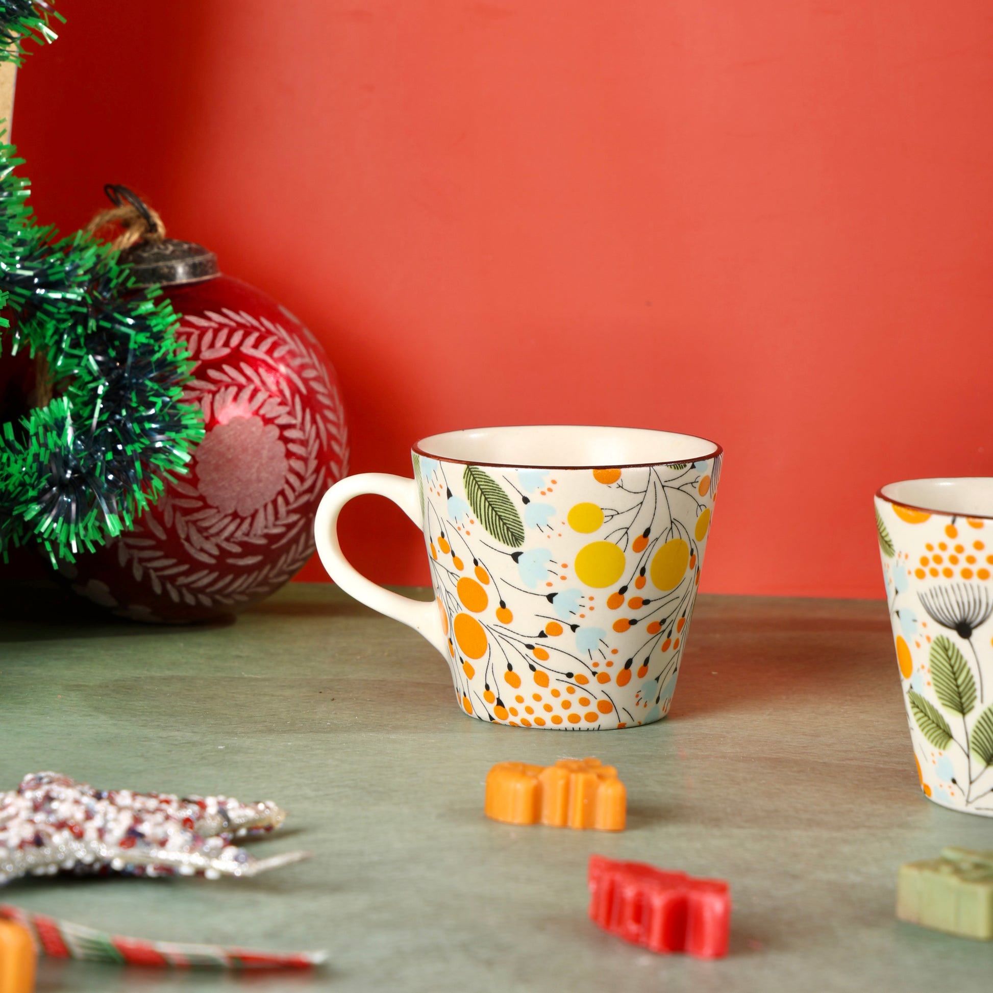 These charming ceramic espresso cups feature a delightful hand-painted floral motif in tones of a citrus summer. With their earthy aesthetic and traditional design, they bring a touch of vintage elegance to your coffee moments.