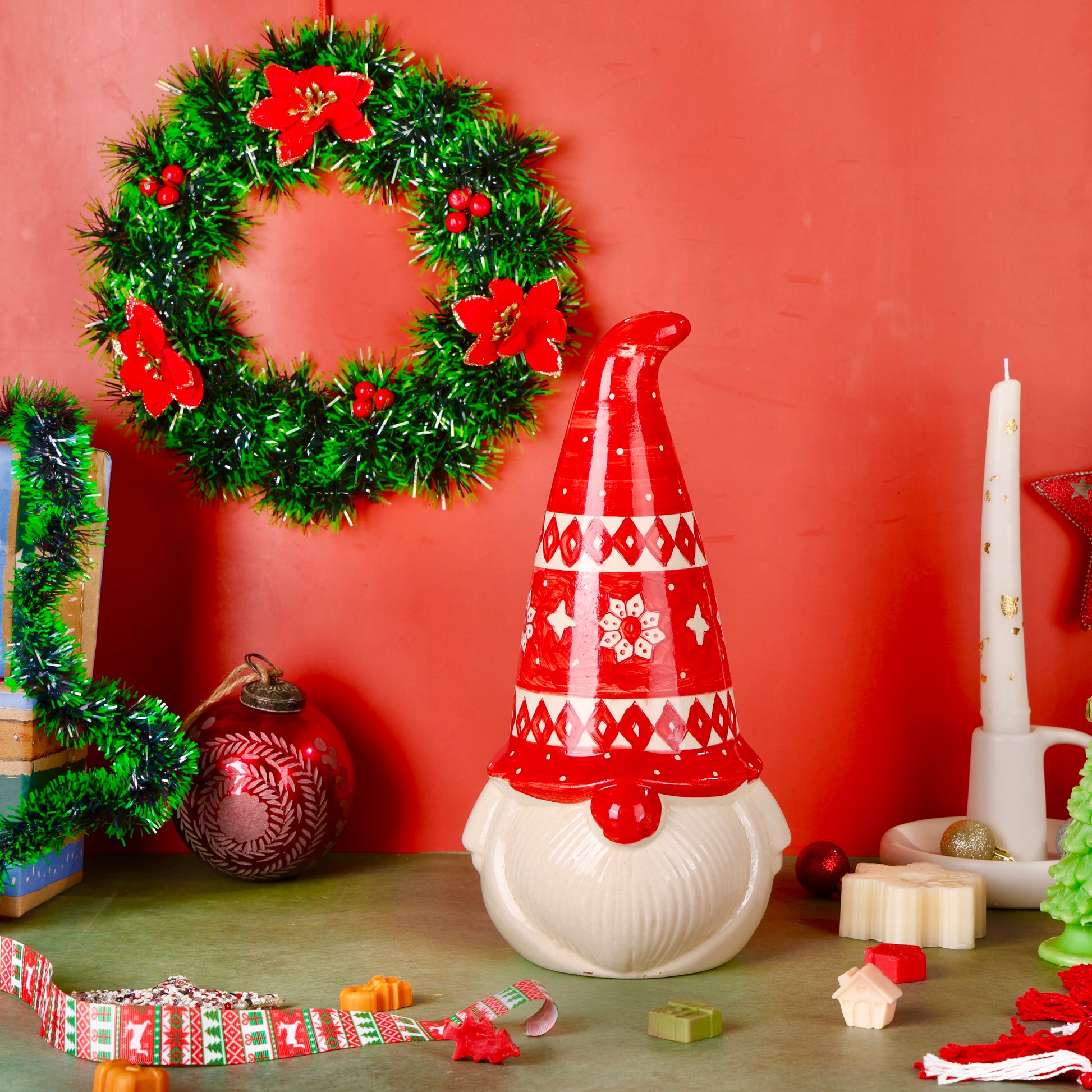 Celebrate the charm of winter with this delightful handpainted ceramic Santa decor. Lovingly crafted with intricate details and vibrant colors, this piece captures the essence of the season with a whimsical flair. Perfect as a centerpiece or a festive accent for your mantel, table, or shelf, it brings warmth and character to your fall gatherings. Whether for Christmas or as a year-round touch of rustic charm, this Santa decor is a cheerful addition to any space.