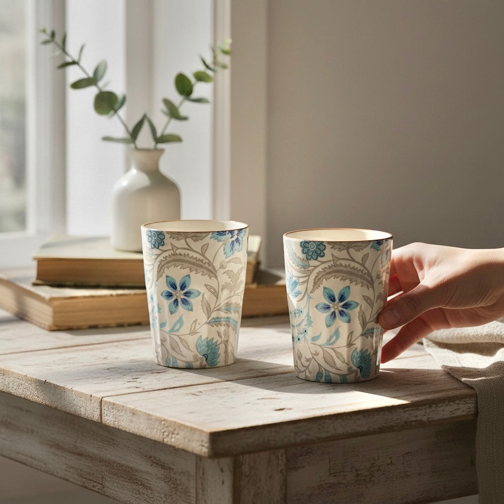 An elegant set of glasses for juice or water. Use it as a staple for your meals and a touch of class to your everyday routine. Adorned with delicate indrani bagh blue coloured motifs, these pieces won’t last on our shelves for long. So get your set today. Also makes for a very thoughtful gift.