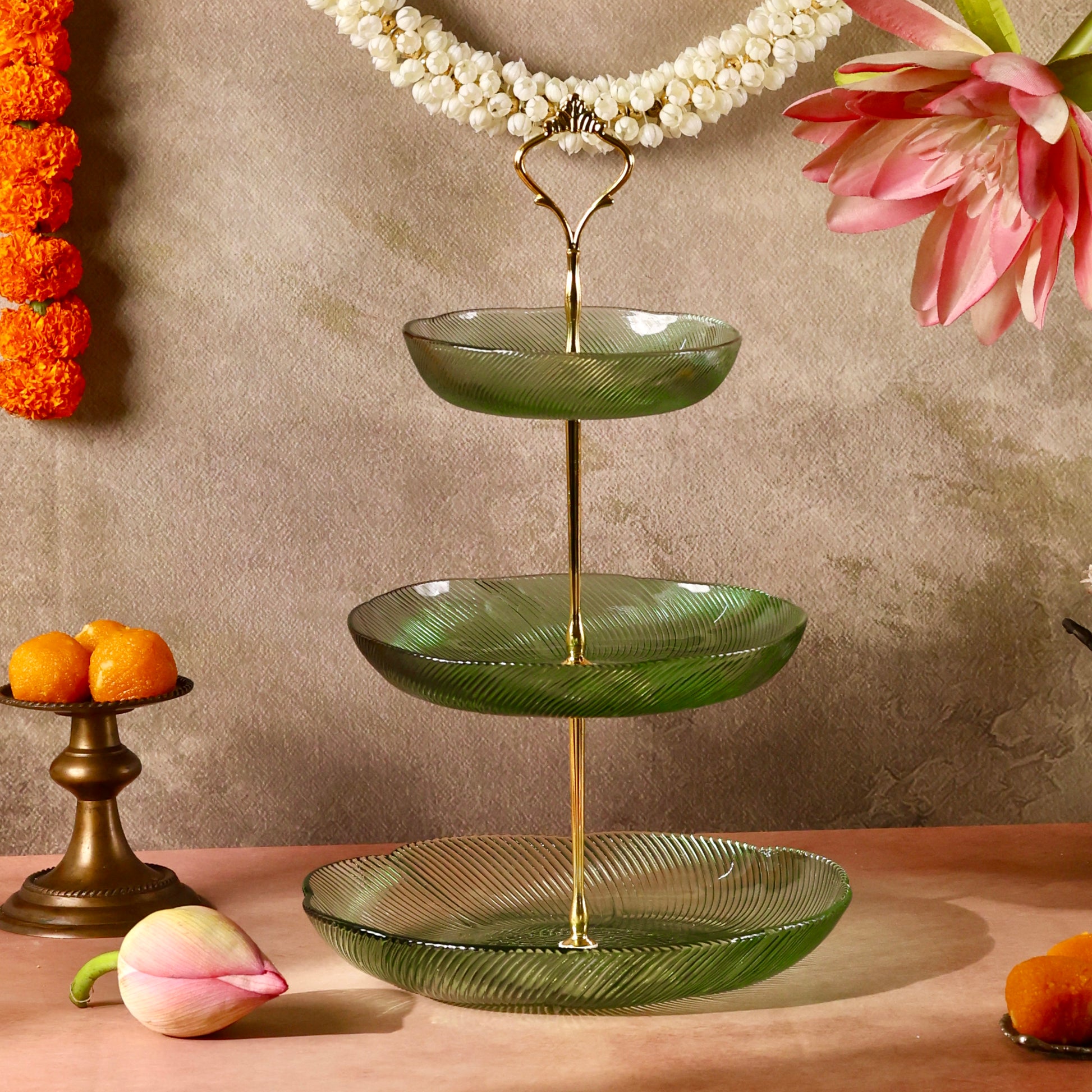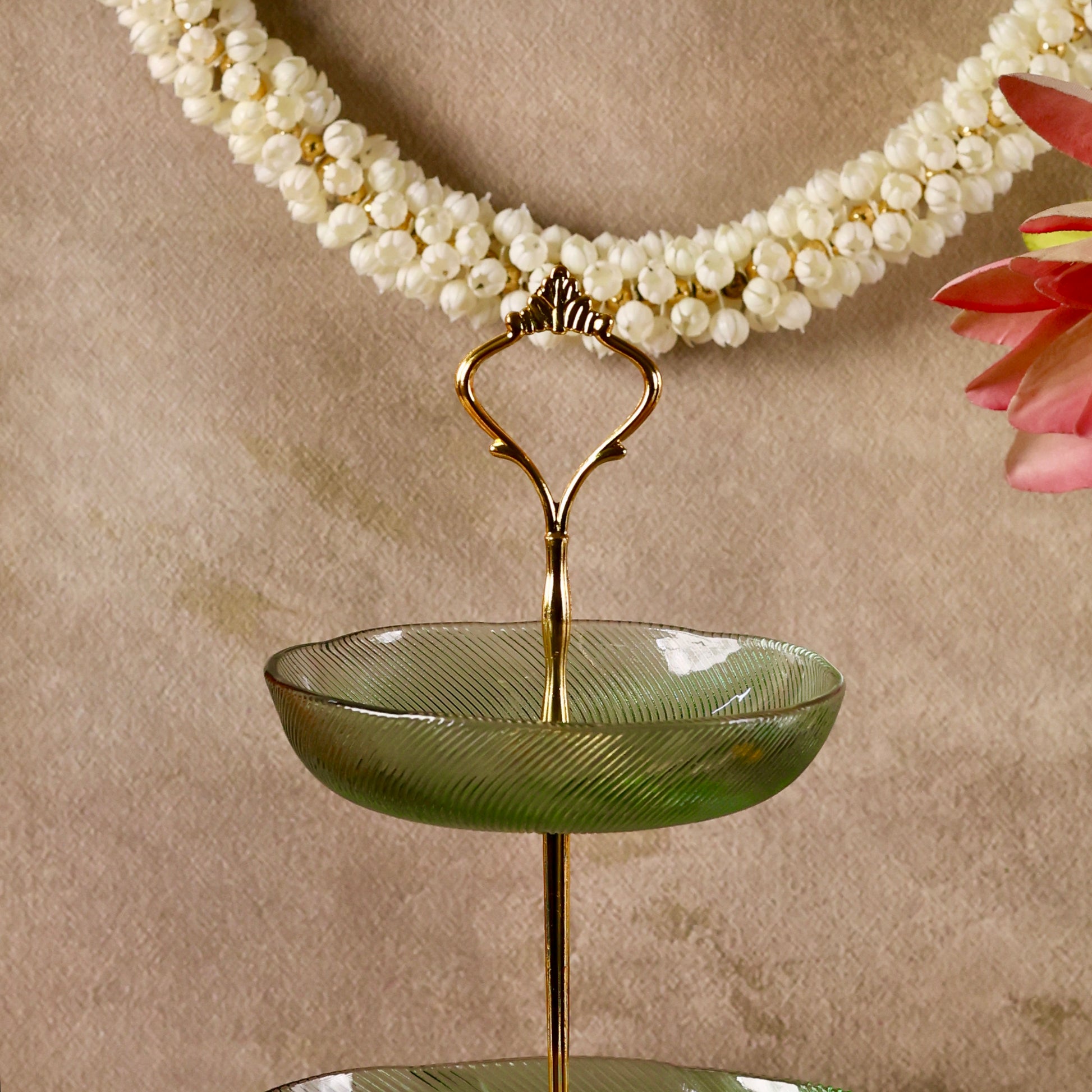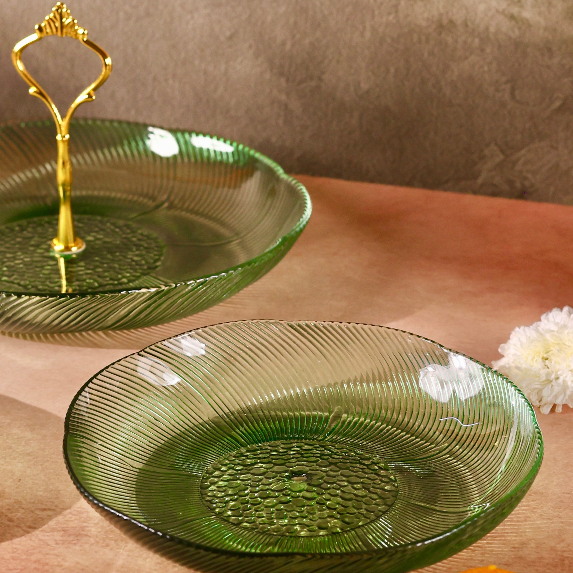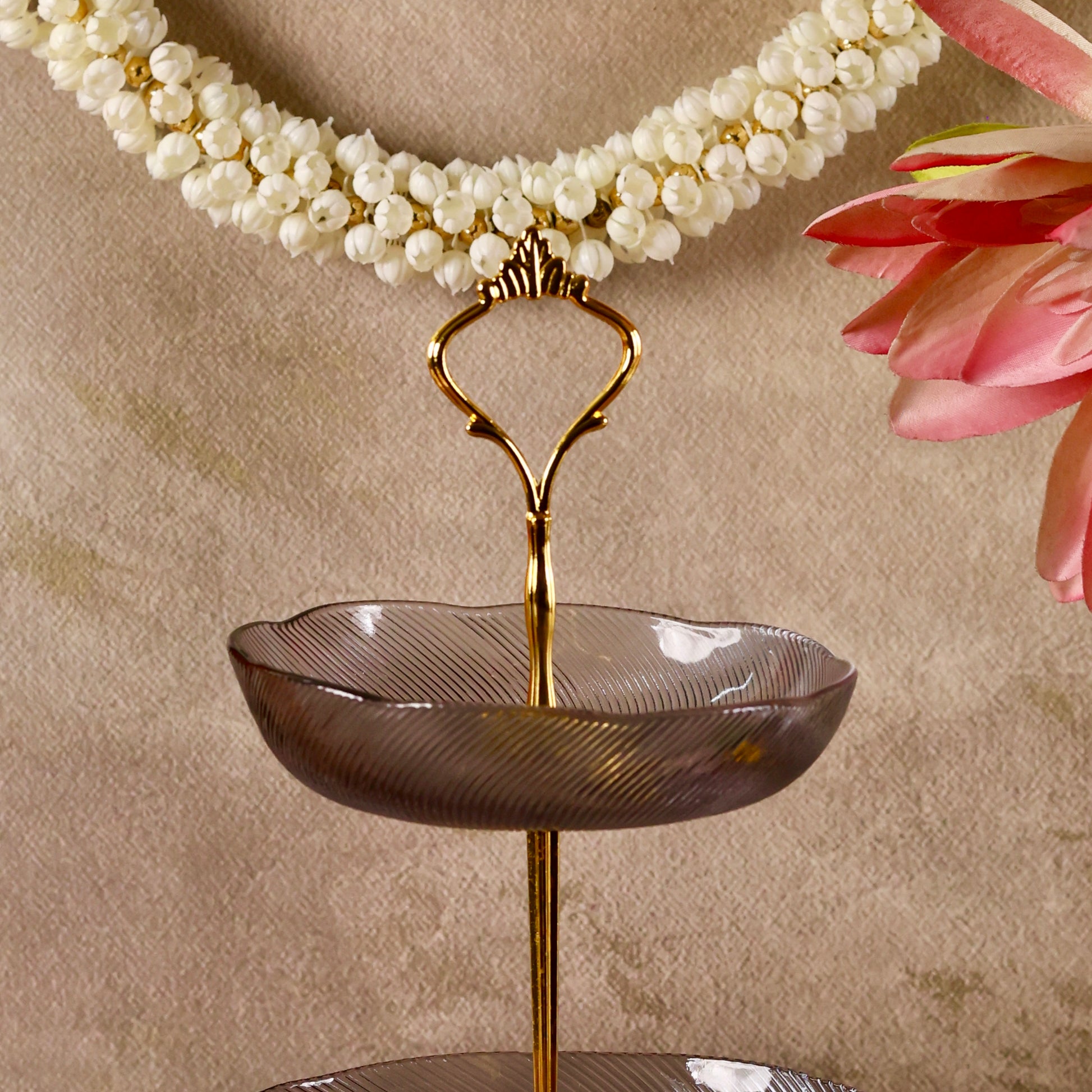 Discover sophistication and style with our Glass Stand or Platter, beautifully embellished with a Luxurious Floral Pattern. Elevate your dining experience as this captivating fusion of coloured glass and florals meets the modern appeal of a tiered stand, creating a unique and elegant centerpiece for your table. Use it to serve some delectable creations this festive season making hosting a breeze. Comes disassembled and can be easily stored. You can even use each tier separately as a shallow glass bowl or fruit platter.