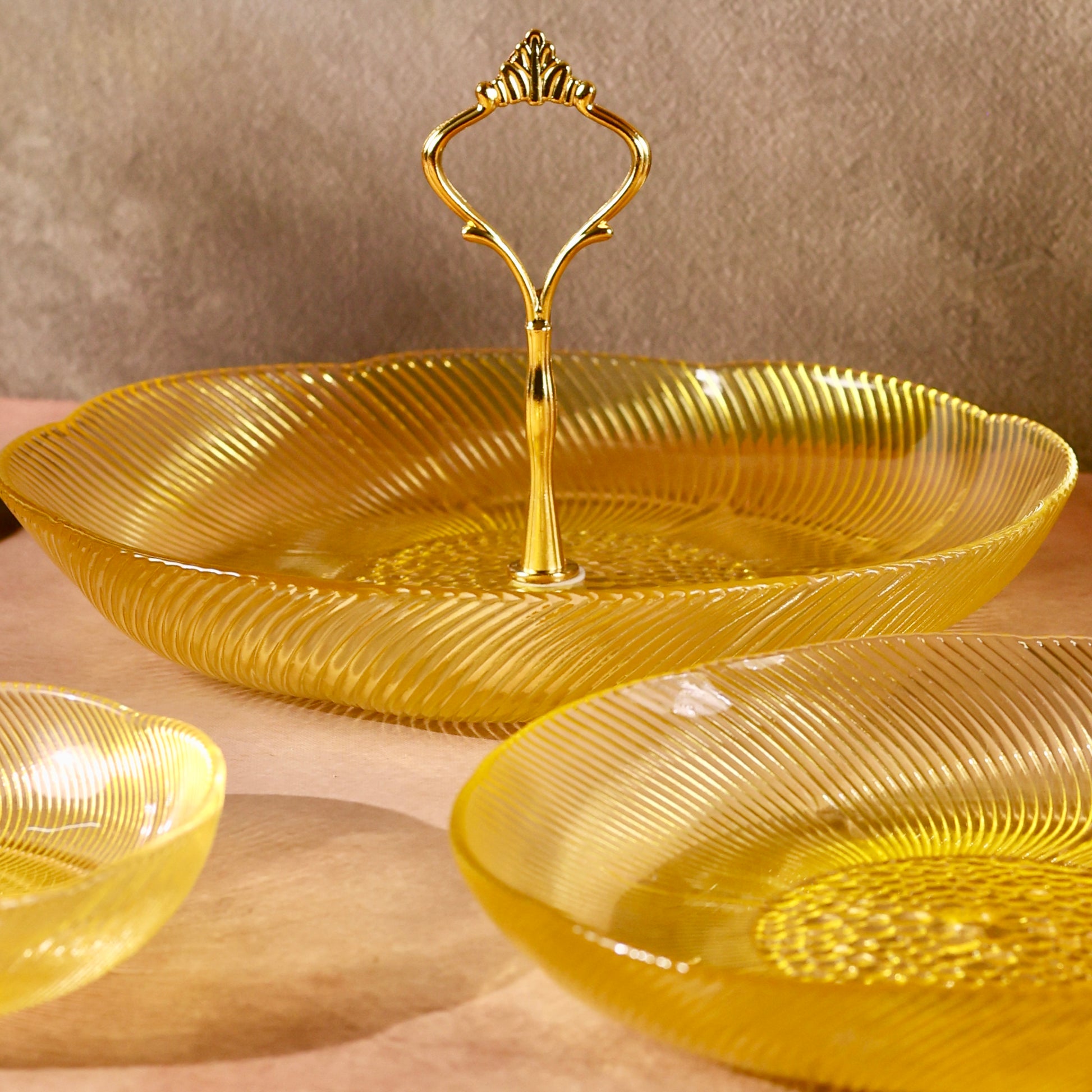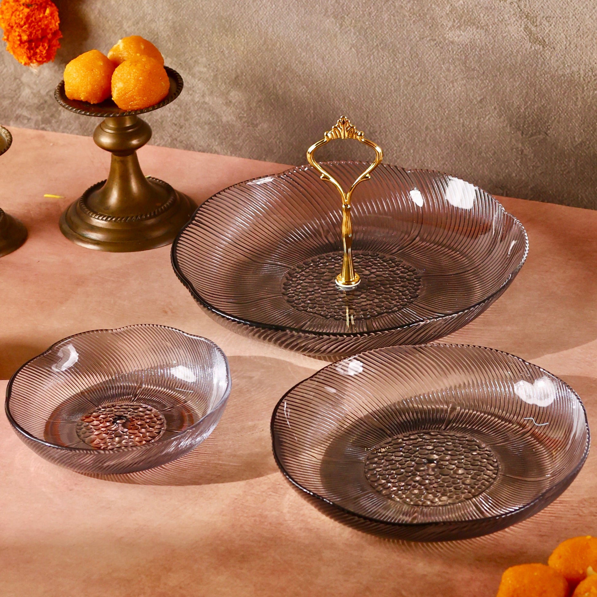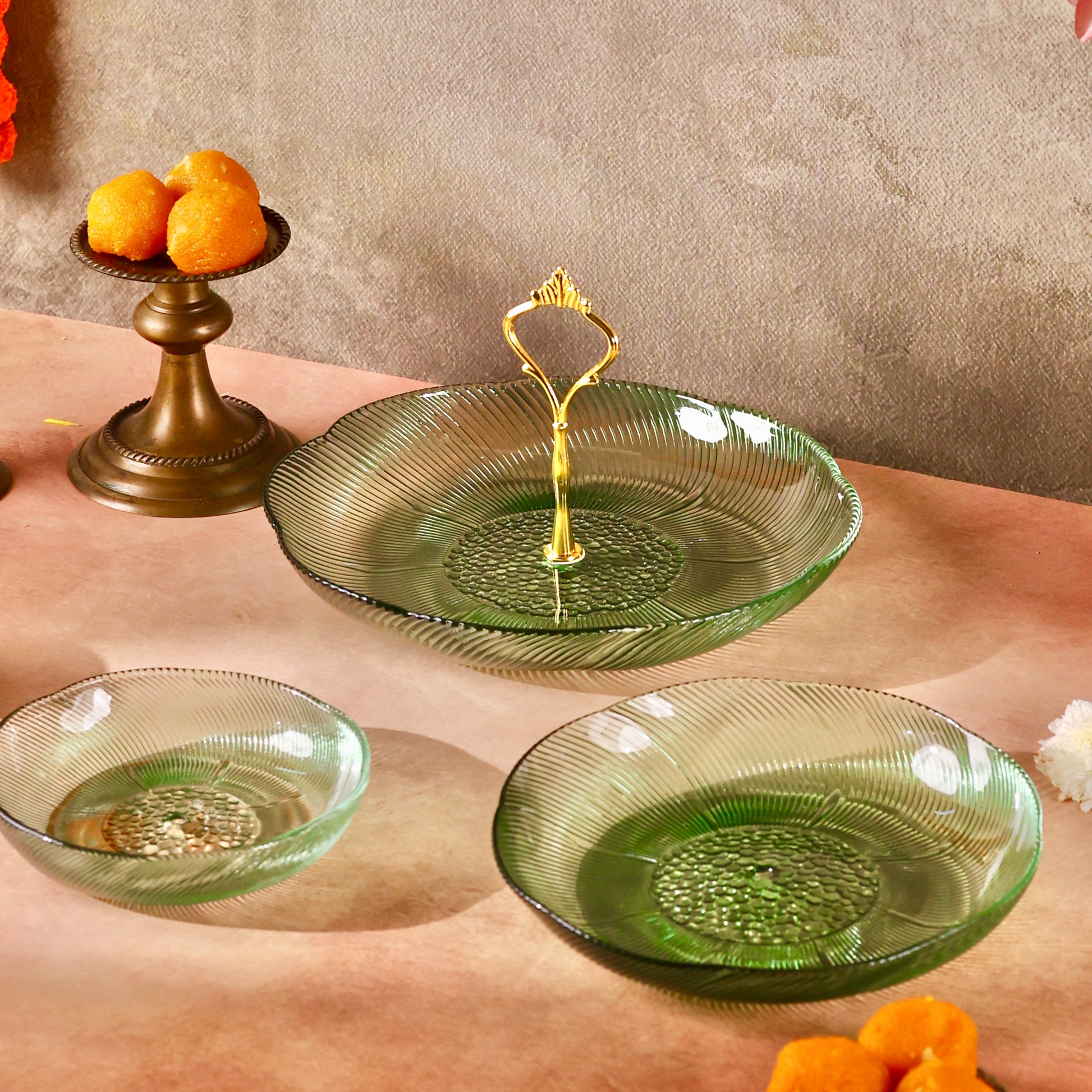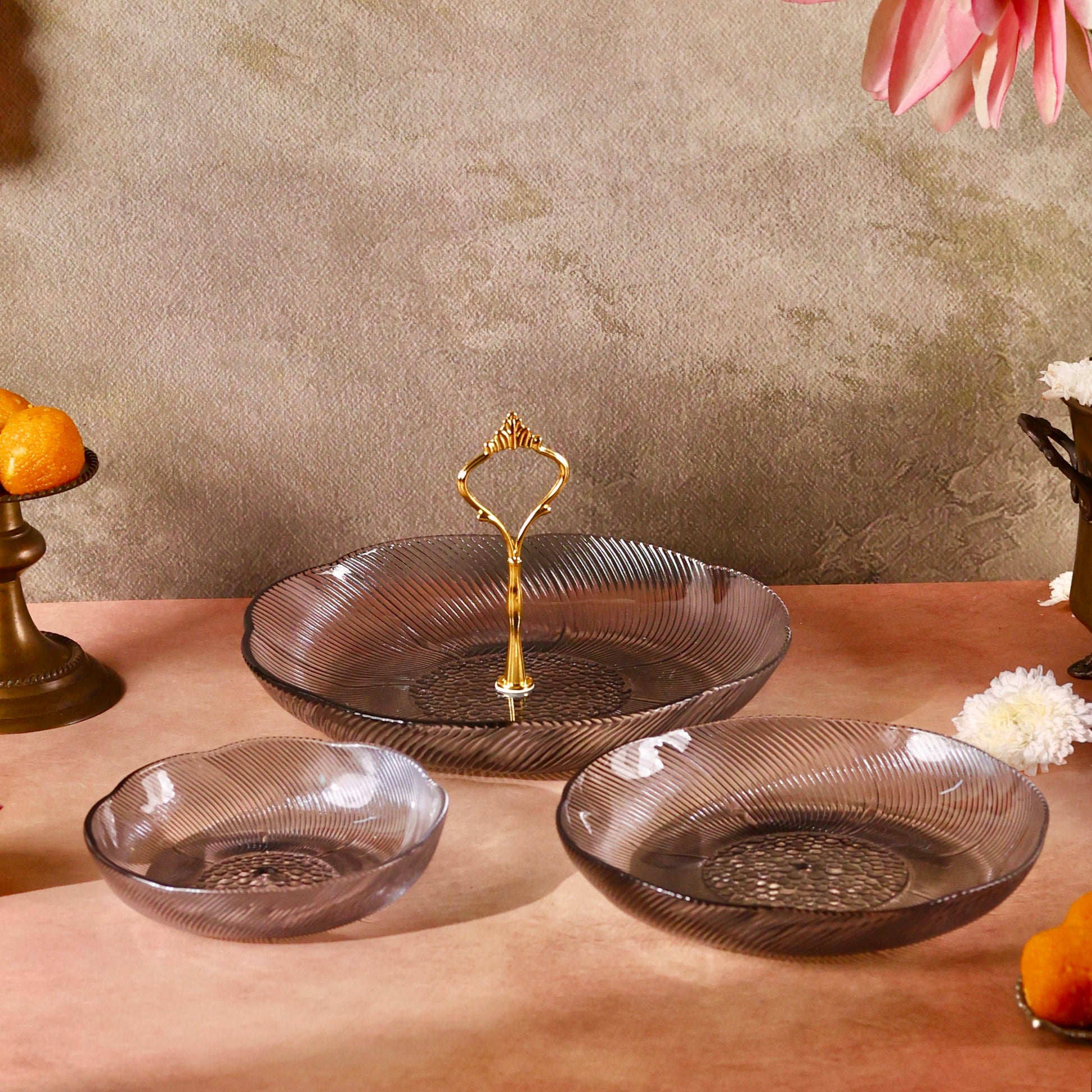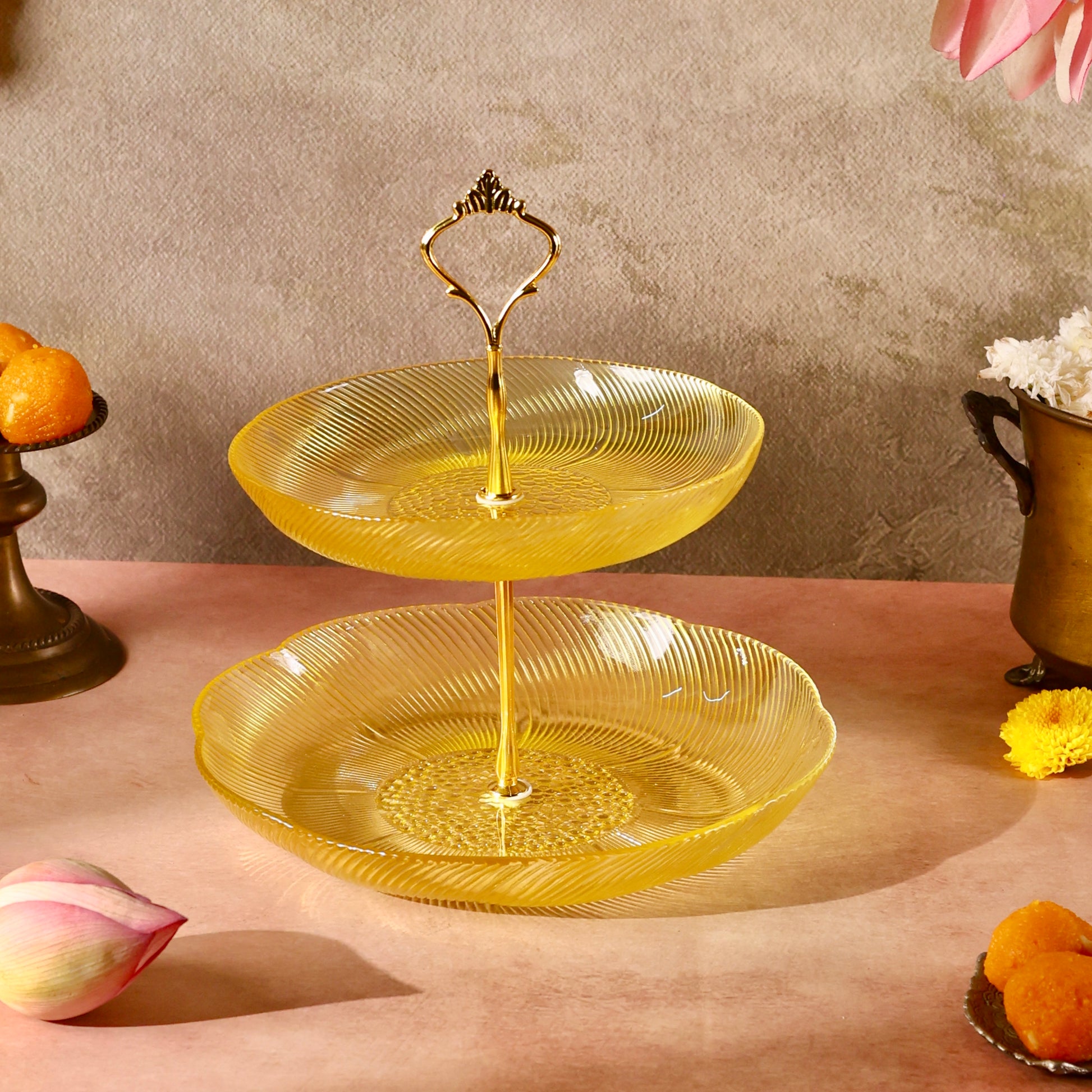 Discover sophistication and style with our Glass Stand or Platter, beautifully embellished with a Luxurious Floral Pattern. Elevate your dining experience as this captivating fusion of coloured glass and florals meets the modern appeal of a tiered stand, creating a unique and elegant centerpiece for your table. Use it to serve some delectable creations this festive season making hosting a breeze. Comes disassembled and can be easily stored. You can even use each tier separately as a shallow glass bowl or fruit platter.