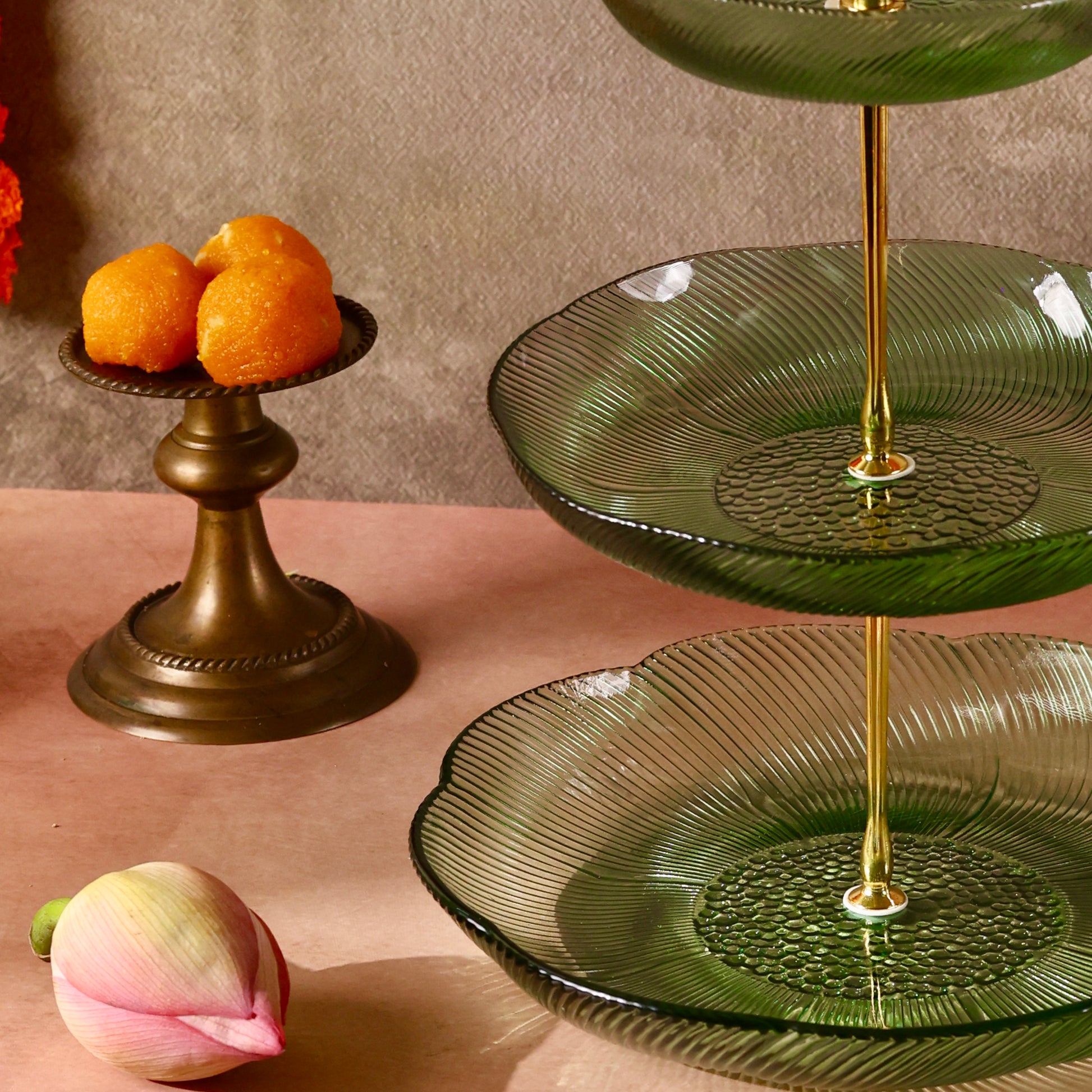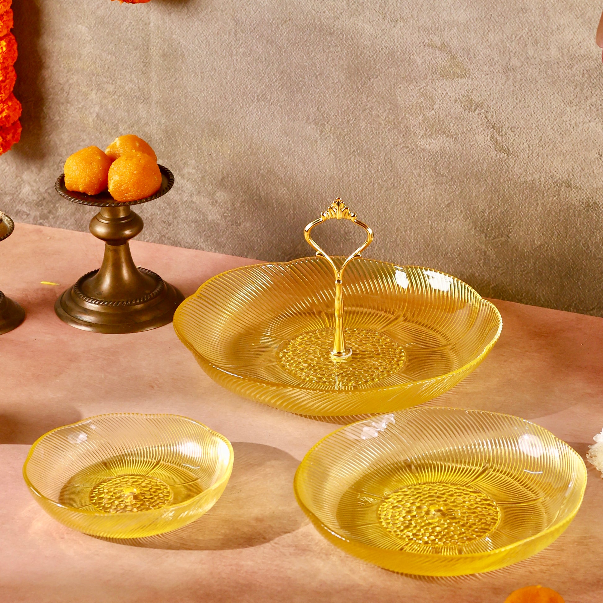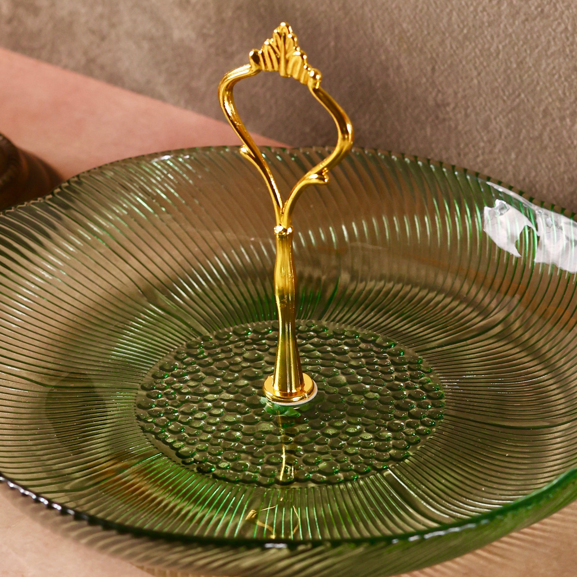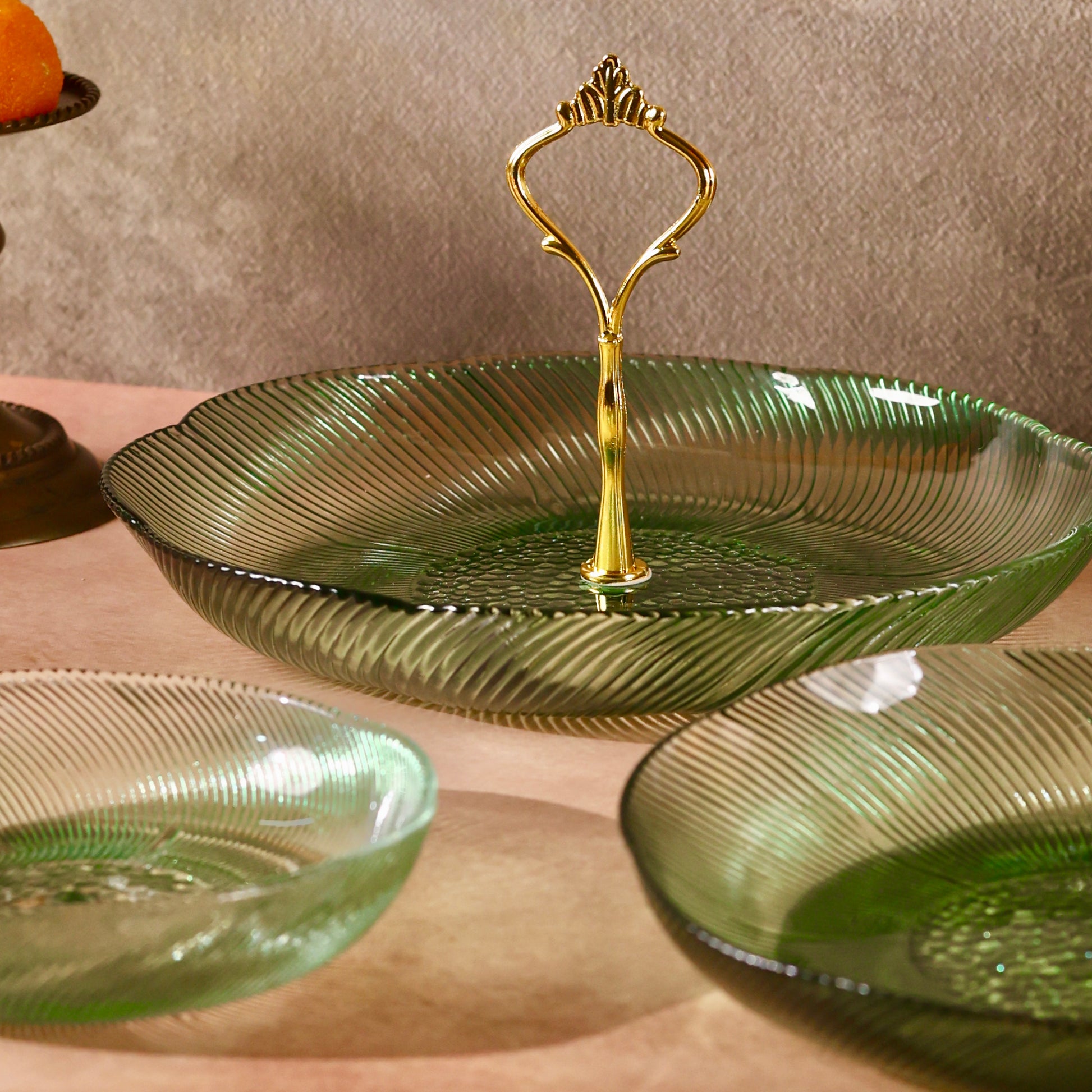 Discover sophistication and style with our Glass Stand or Platter, beautifully embellished with a Luxurious Floral Pattern. Elevate your dining experience as this captivating fusion of coloured glass and florals meets the modern appeal of a tiered stand, creating a unique and elegant centerpiece for your table. Use it to serve some delectable creations this festive season making hosting a breeze. Comes disassembled and can be easily stored. You can even use each tier separately as a shallow glass bowl or fruit platter.