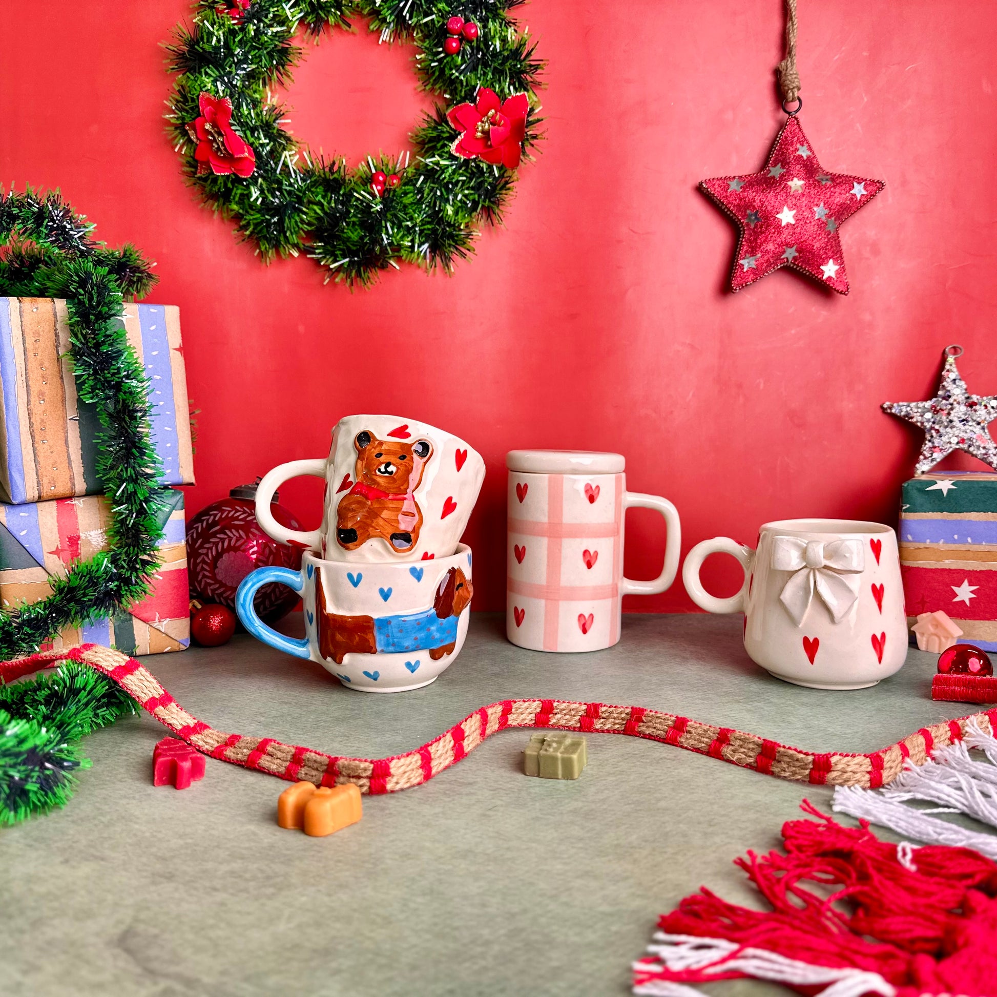 Bring home a bundle of joy with The Holiday Heartwarming Mug Set — a charming collection of four handcrafted mugs designed to make every sip feel extra special. Featuring an adorable teddy, a cozy dachshund, a sweet bow-accented mug, and a pink checkered heart mug, this set beautifully blends cuteness with festive cheer.